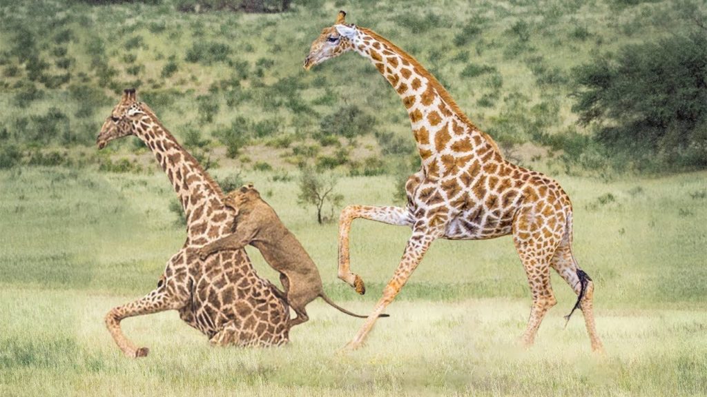 When lions get really hungry, a pride (several lions in a group hunting) may decide to attack. The easiest target would be a giraffe baby, but they are often under mums protection.